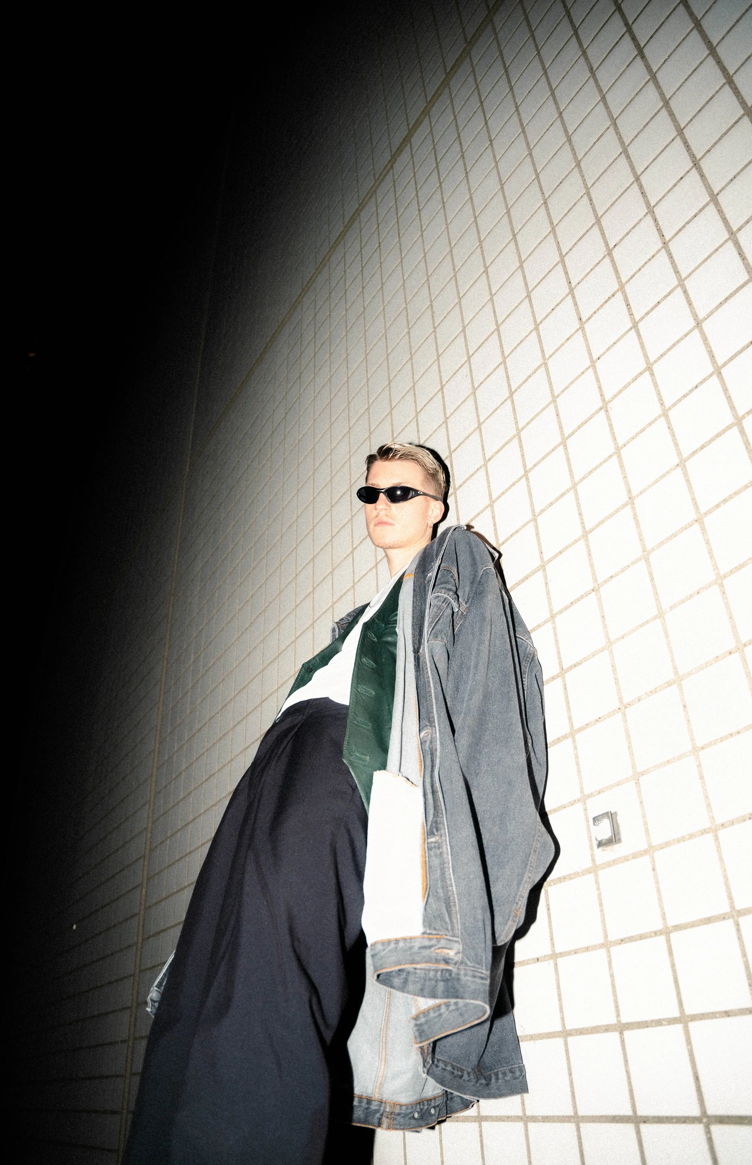 Young man wearing sunglasses, a white t-shirt, a green jacket, and dark pants, leaning against a tiled wall with a high-contrast perspective.