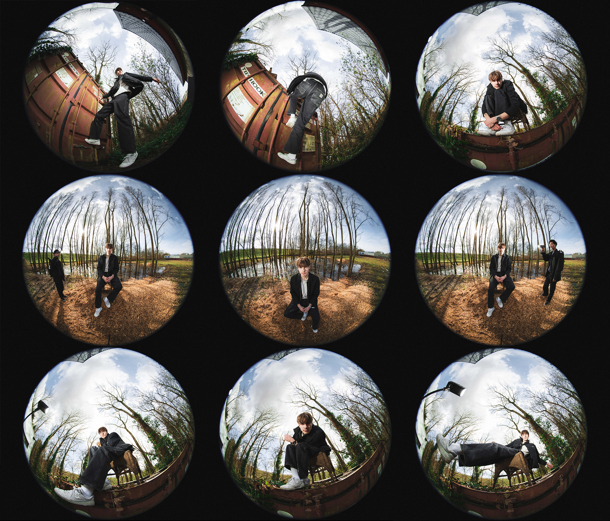 Collection of nine fisheye photos of a young man outdoors in various poses with trees, sky, and a park setting, including walking, sitting, and lying on a bench or the ground.
