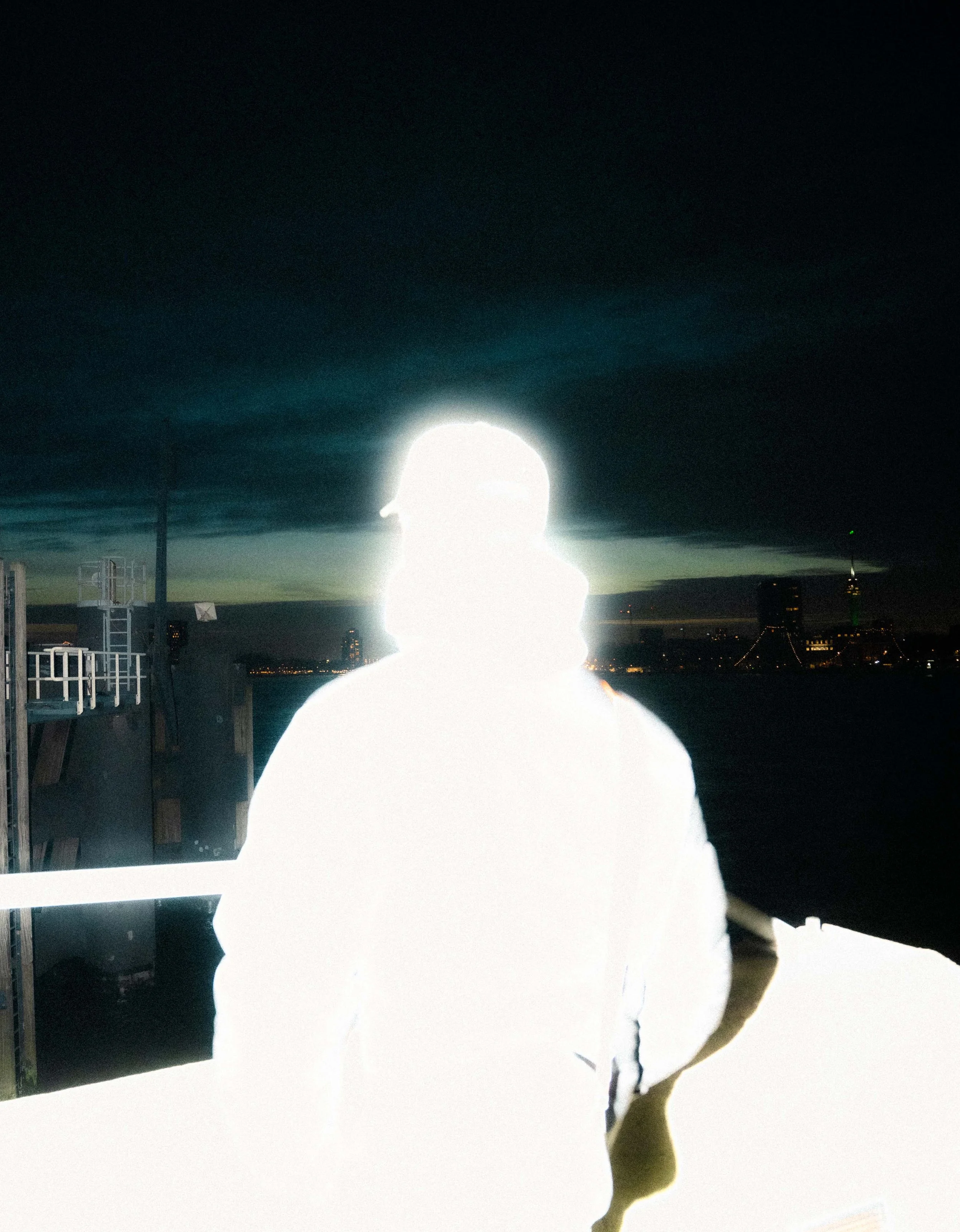 Overexposed silhouette of a person standing outdoors during nighttime, with a dark sky and city lights in the background.