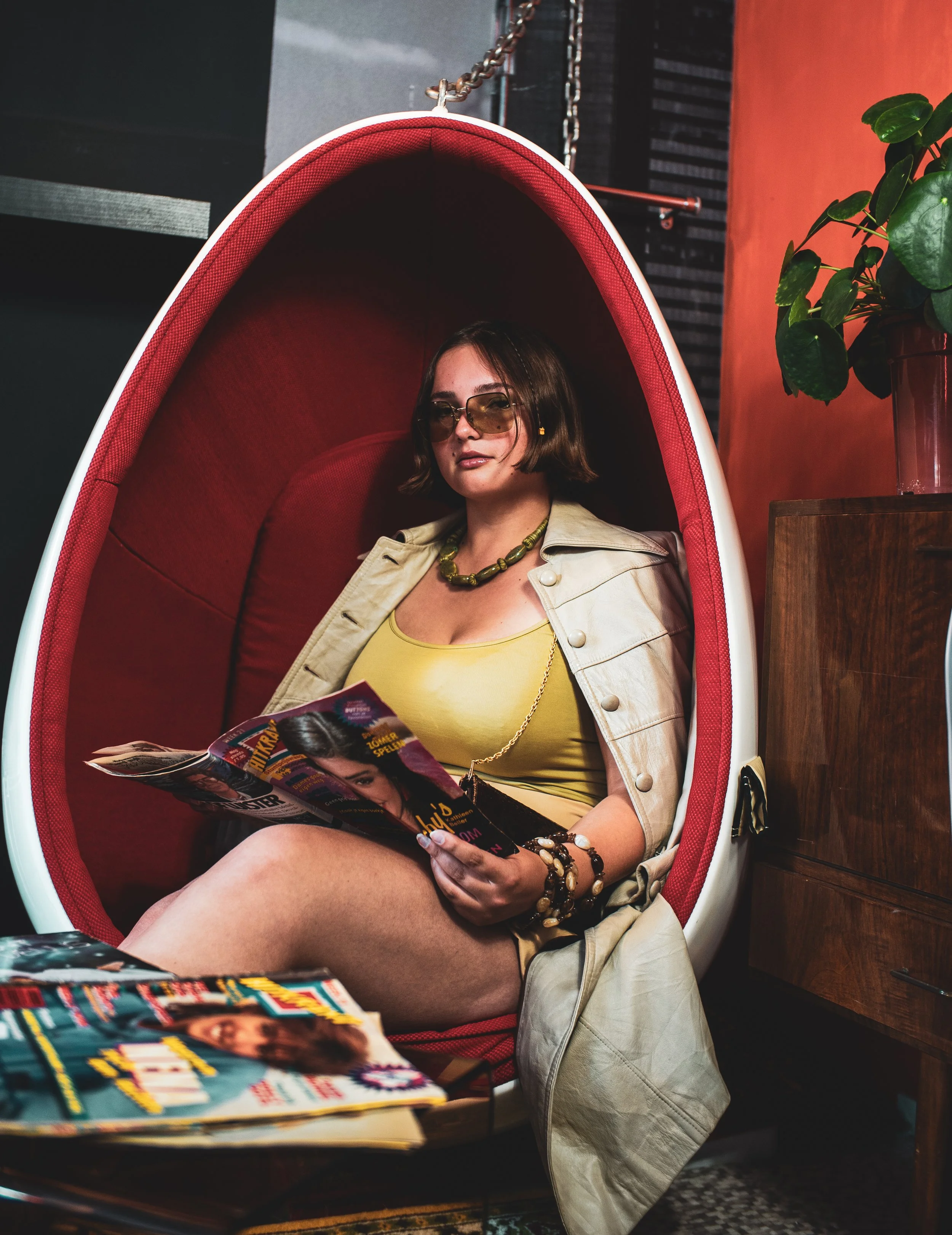 Woman in retro glasses and jewelry sitting inside a red and white egg-shaped chair, reading a magazine.