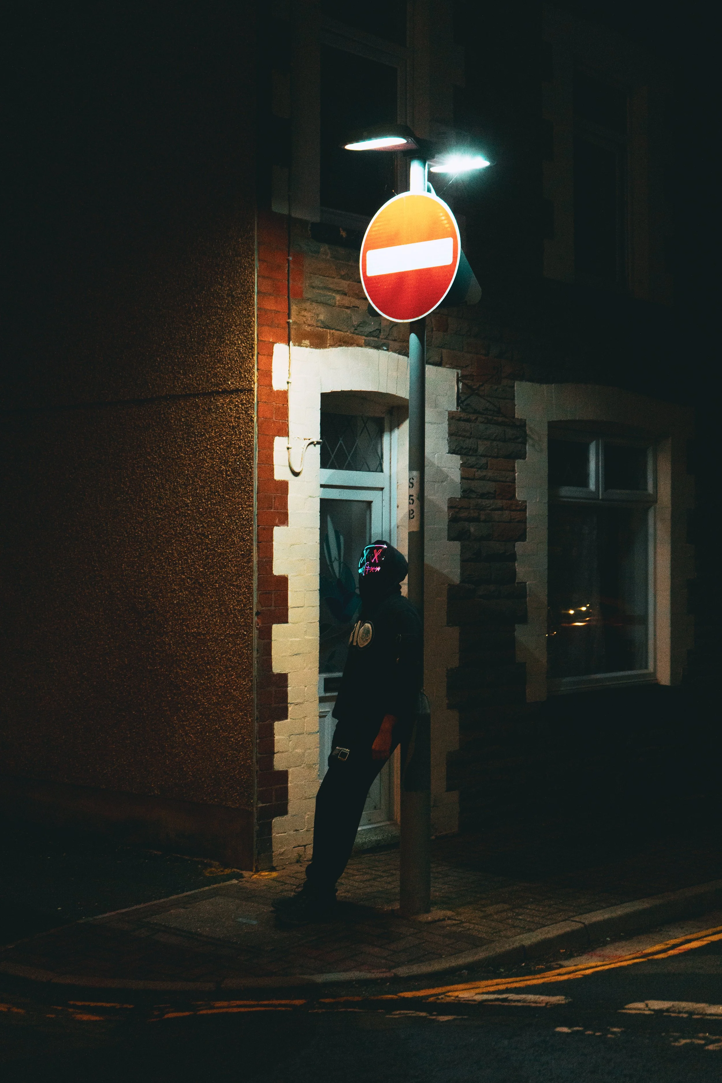 A person wearing a helmet with neon lights and dark clothing leans against a street sign pole outside a building at night, illuminated by a streetlight.