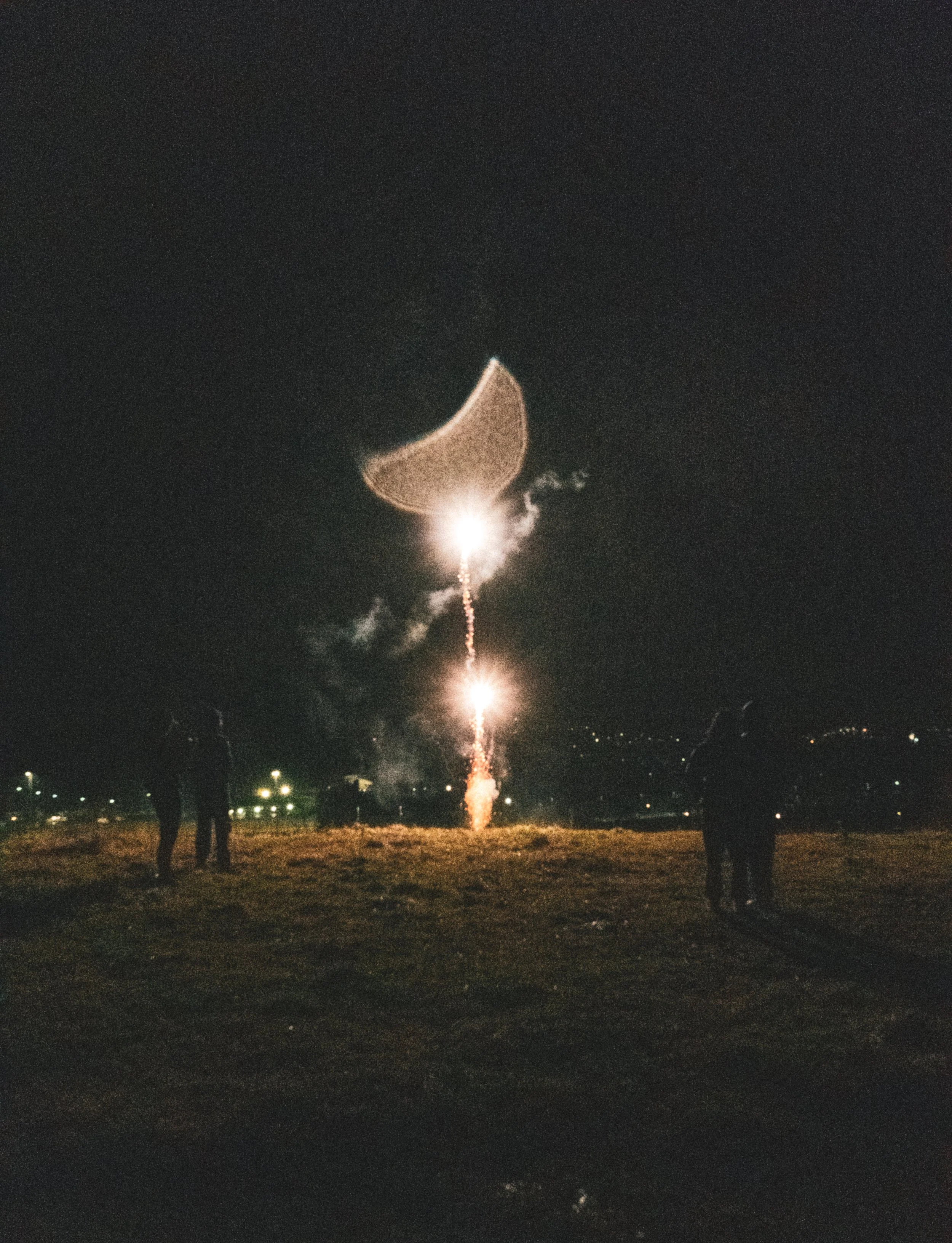 Nighttime scene with three people watching fireworks; fireworks are bright with trails and a crescent-shaped glow in the sky.