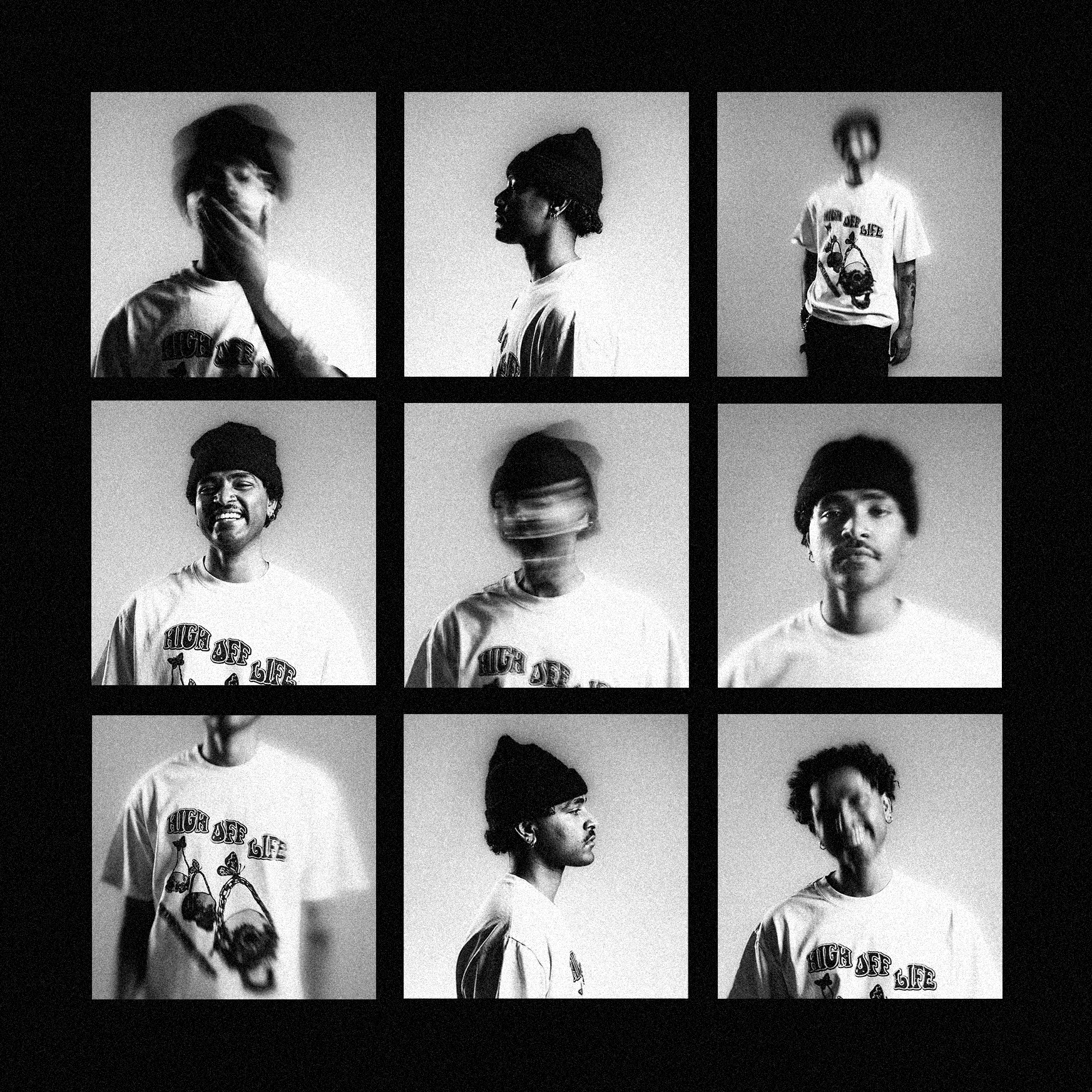 A black-and-white photo collage of nine images, featuring a young woman with short hair and a beanie, wearing a graphic t-shirt with the words "High Off Life" and a skateboarding design, in various poses and expressions, with some images showing moti