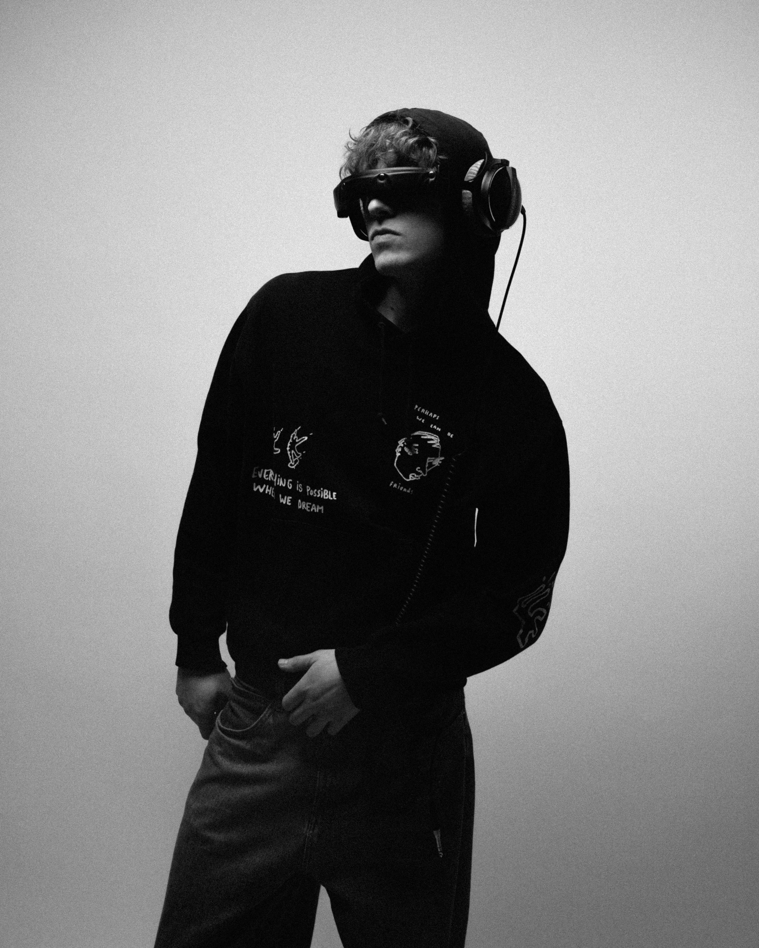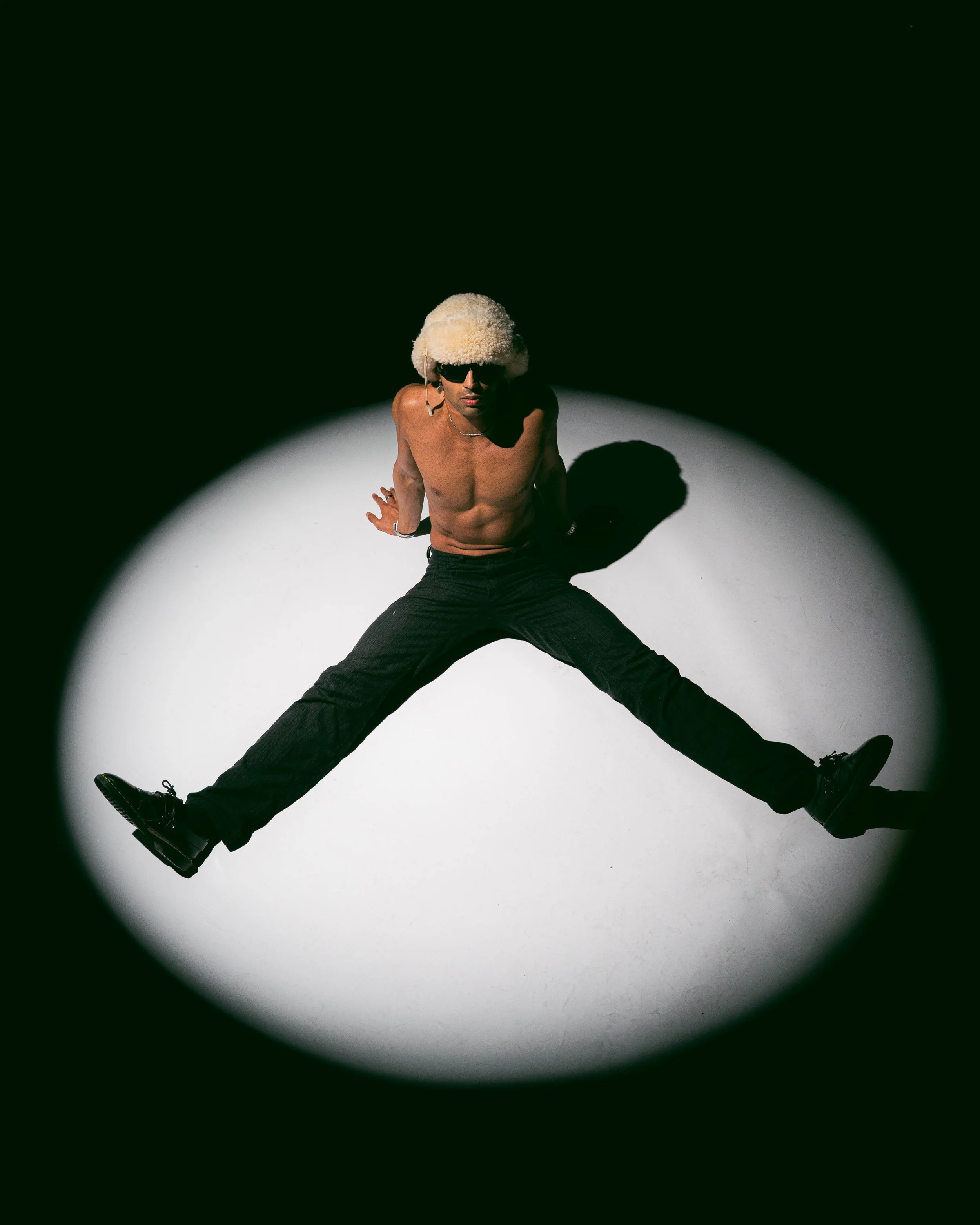 A shirtless man with platinum blonde hair, wearing sunglasses, performs a wide-legged jump against a white background, surrounded by a black vignette