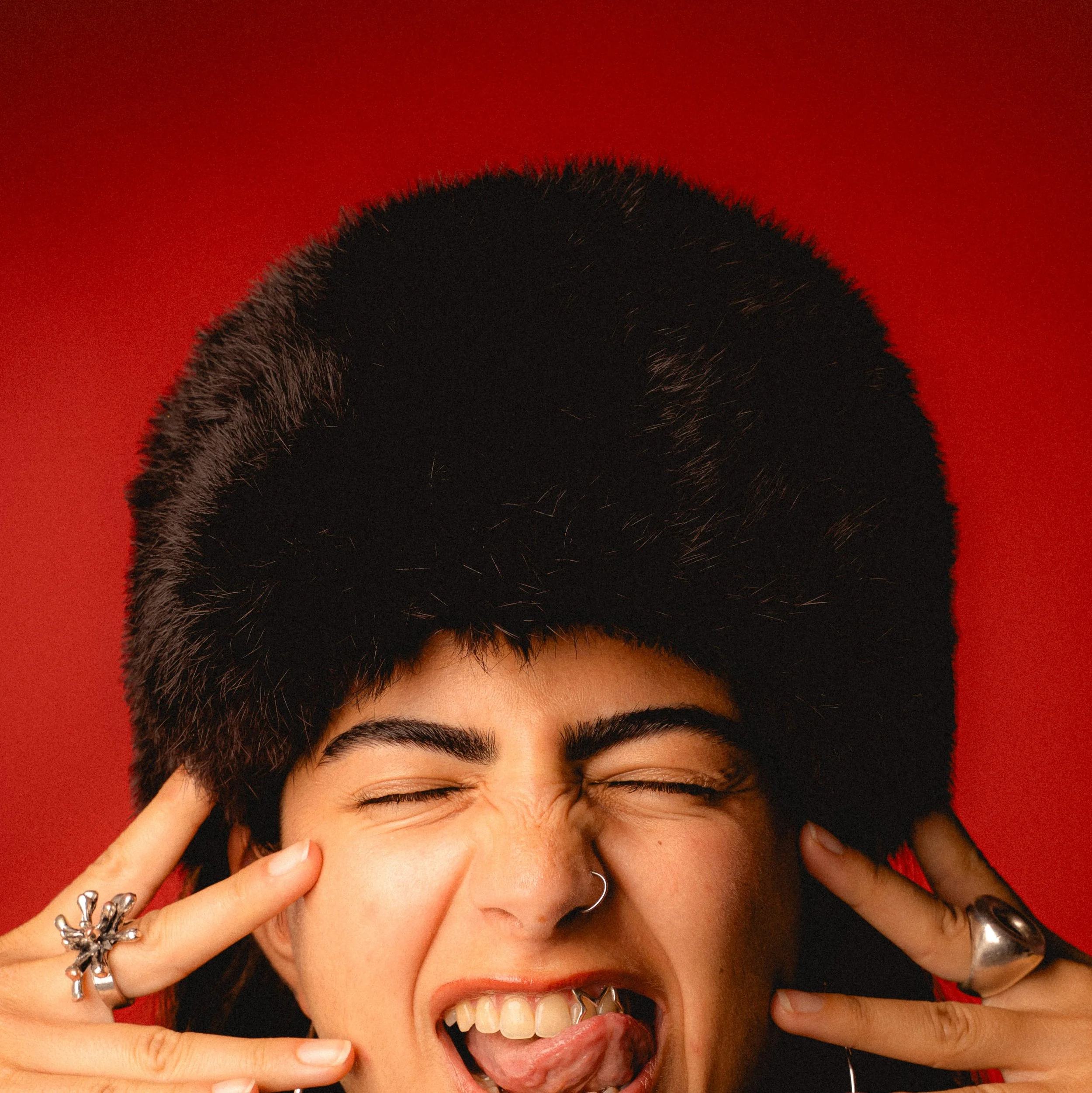 A woman with short dark hair wearing a large black fur hat, making a playful face with her eyes closed, tongue sticking out, and fingers touching her face against a red background.